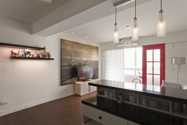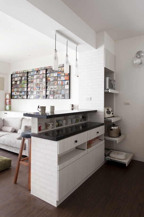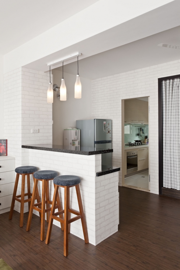 取代餐桌的餐檯具備雙層檯面與收納設計,吧檯主體與相鄰家電櫃以倣文化石磚牆的立體壁紙修飾外觀,搭配三盞玻璃吊燈強化機能區域,硬體配備輕巧的拉抽板,使用非常方便。