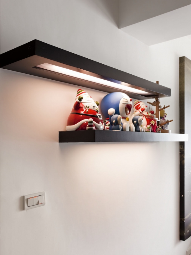 客廳主牆旁特製兩列燈光層架,除了展示,還有別出心裁的照明功能。