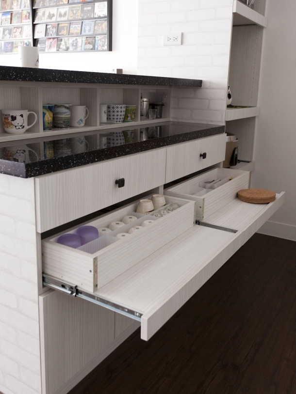 吧檯櫃與相鄰家電櫃在硬體機能上配備輕巧的拉抽板,使用非常方便。