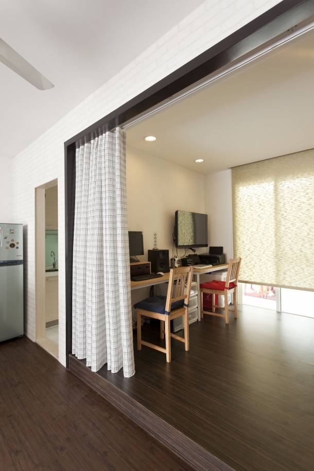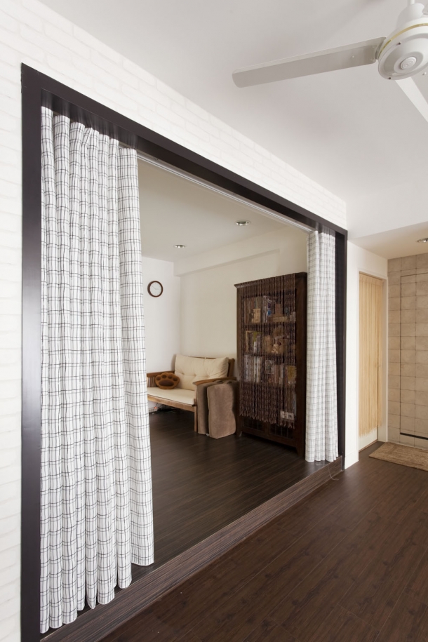 架高的書房滿鋪木質地板,搭配蛇行布簾隔間,兼具休閒區的休憩機能。