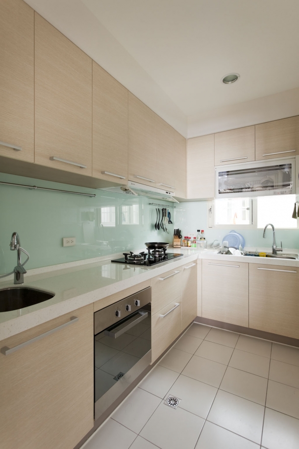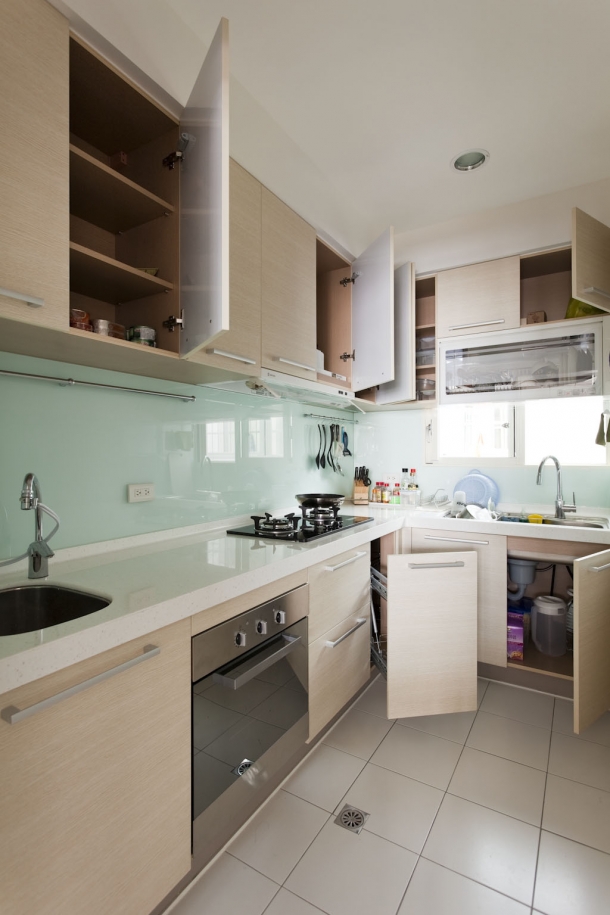清爽的廚房擁有機能強大的L型工作區,豐富的上下櫃收納讓廚房隨時都能保持明亮潔淨。