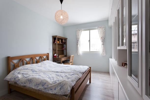 雅緻明亮的主臥室,牆面淺藍色塗裝與充足的光線相呼應,釋放宜人的休憩溫度。