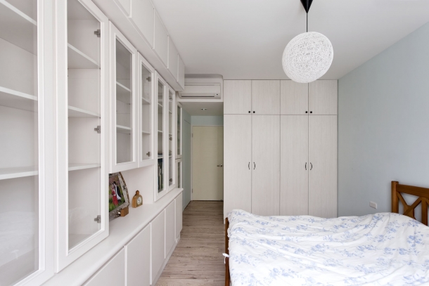 主臥室床尾與床側分別歸納大容量的衣櫃與多用途櫃,簡化的線條與清淺色系,營造連續面的造型美感。