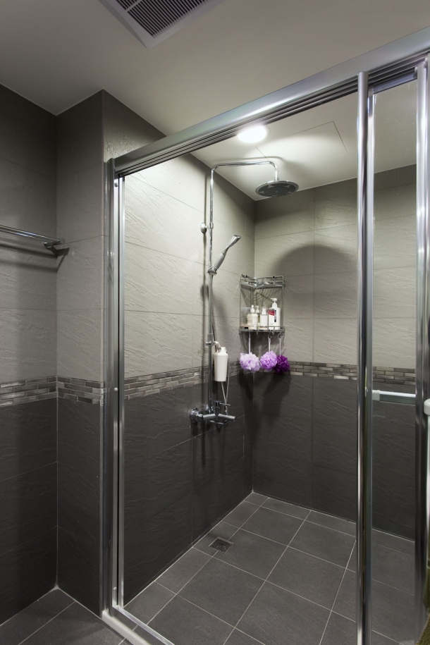 將兩間合為一間的寬敞浴室,超大鏡面有效放大空間,乾溼分離的設計提供人性化生活機能。