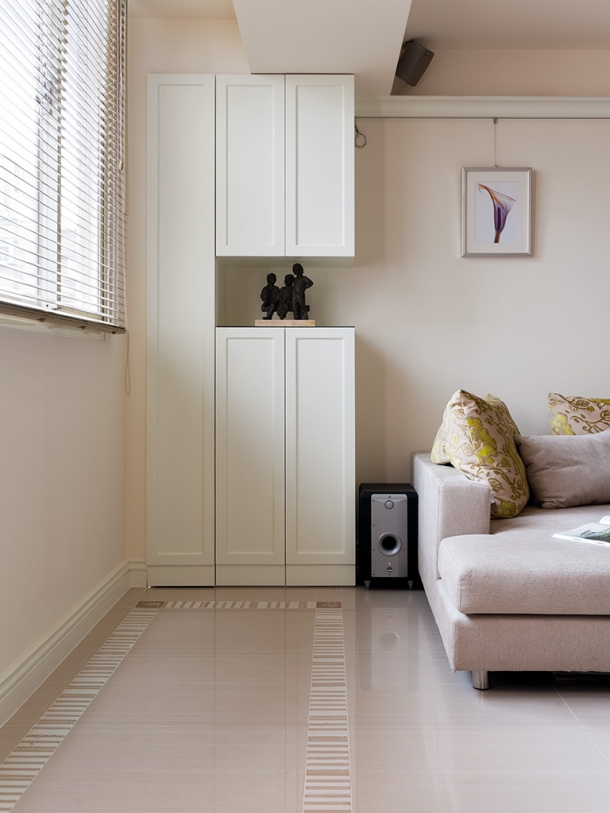 通往主臥室的過道前端,也就是客廳沙發背牆右側,特地以古典飾板修飾銳角,維護造型背牆的整體美感。