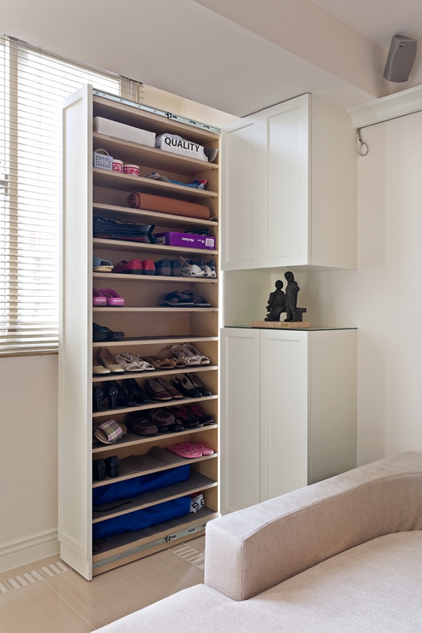 玄關收納櫃的設計饒富巧思,其中最左側為深度較長的直式拉櫃,這是利用深入牆後房間的樑側空間而特製的收納巧思,大大擴充收放鞋類的實用效益。