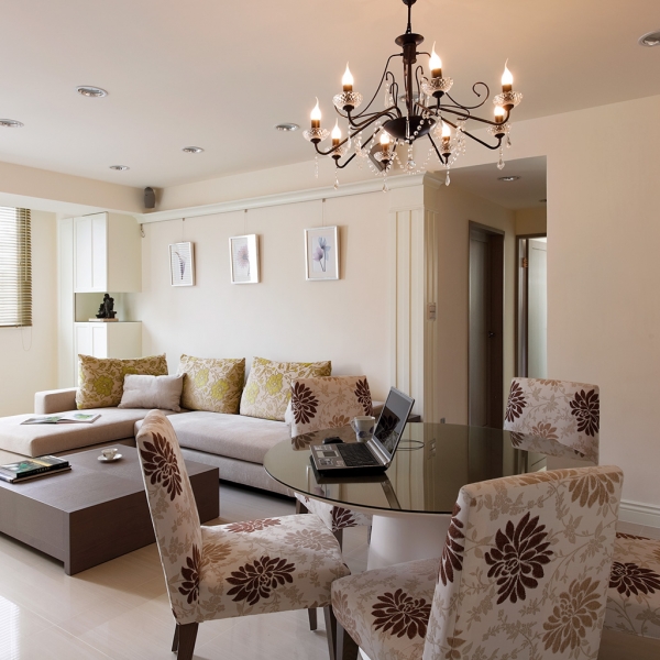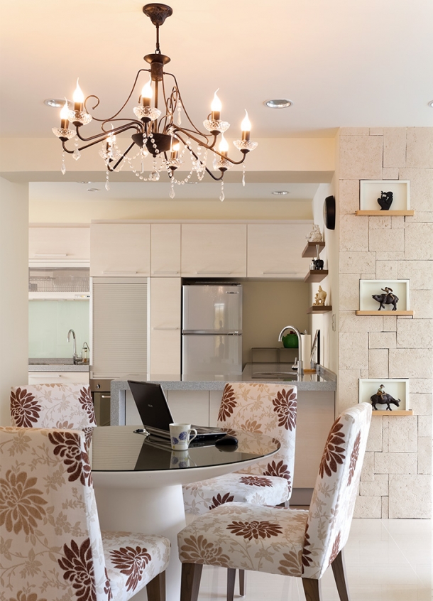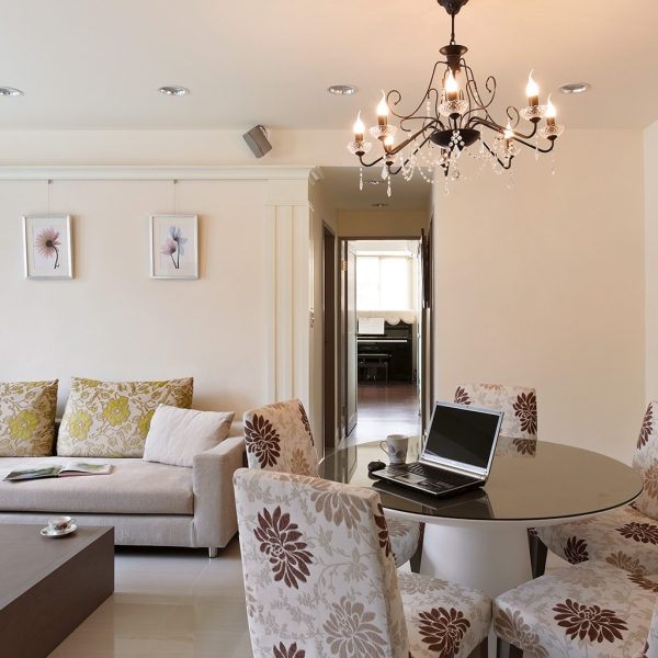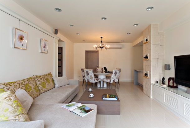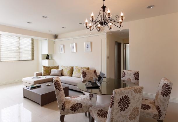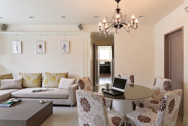 客廳沙發背牆預留畫軌,讓屋主可以隨心情喜好更換各式藝術畫作,橫跨兩區的簡潔天花板造型,沒有多餘的裝飾線條,僅利用一盞水晶燈飾輔助餐桌定位。