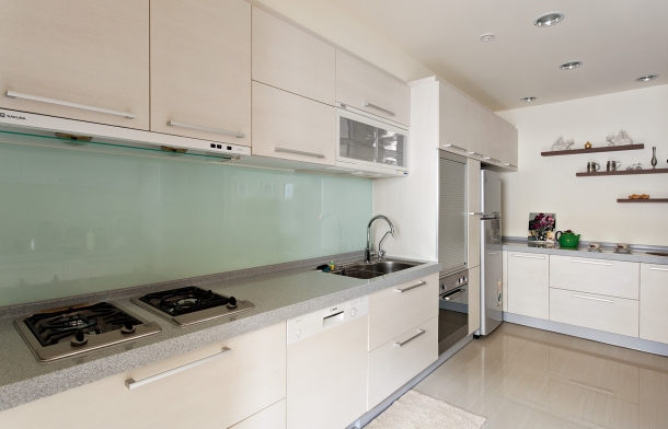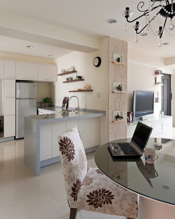 廚房L型的機能配置,納入人性化的作業動線,連大型冰箱都能妥善安置,而白色的客製化廚具,滿足使用者愉快做菜的美麗期待,無接縫的檯面處理,更是大大節省日後清理的時間。