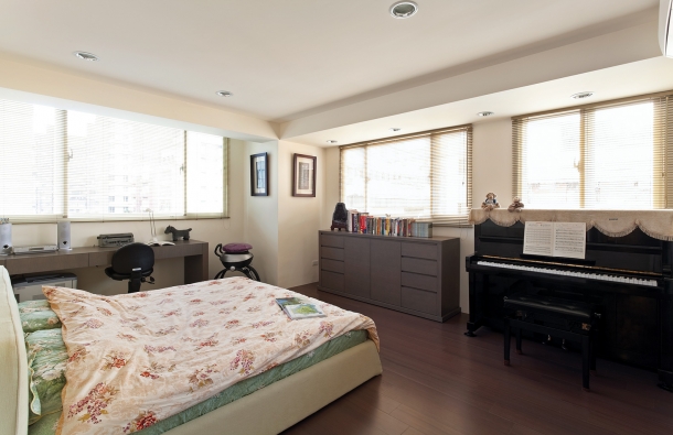 主臥室擁有兩面採光,除了睡眠也匯聚了多樣化的生活機能,包括閱讀區與鋼琴區以及專屬的更衣間、衛浴。