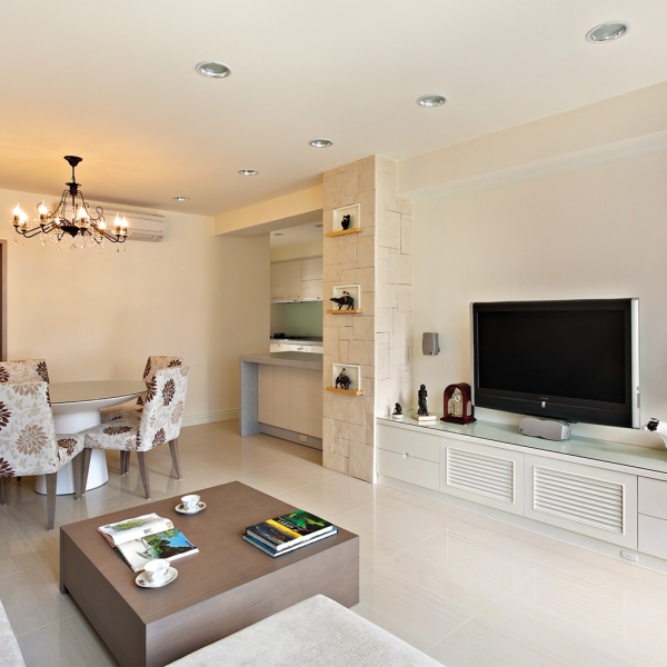 客廳電視主牆以乾淨的留白處理,下方搭配白色百頁視聽櫃,視聽櫃左側原有的結構柱,經過我們的精心改造,正面貼覆質樸文化石襯底,點綴上、中、下三格展示區,不僅是別緻的端景創意,也是客廳與餐廚區之間低調的界定元素。