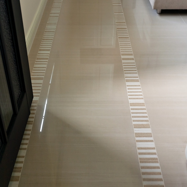 大門進來的視線正前方規劃玄關櫃,地面則以精緻的腰帶花磚點綴於大面積石英磚,拼出暗示動線的美麗圖案。