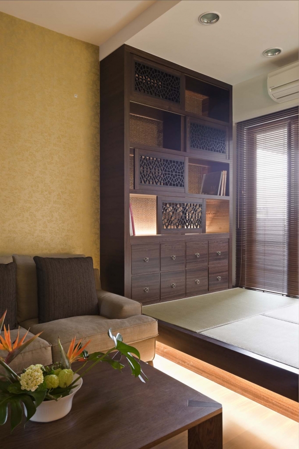 客廳旁的架高休閒區,將舒適的榻榻米層掀起之後,下方即為可動式木地板,將地板掀開來則為實用的收納空間。