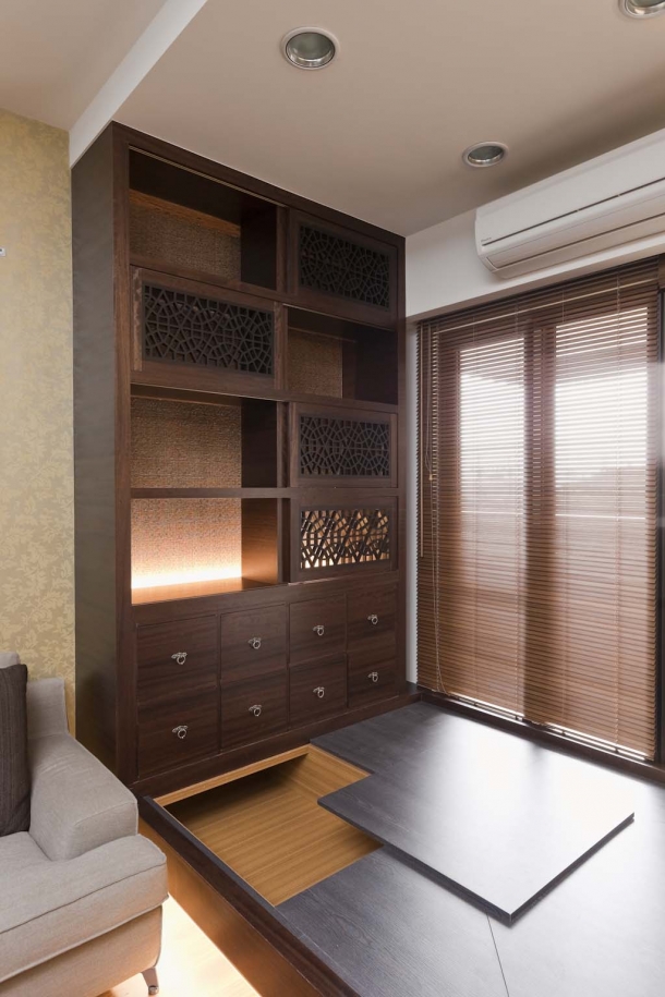 客廳窗前休憩區左側靠牆打造成別緻古典書櫃,後靠背景以金色華貴壁紙烘托,並搭配中式窗花門片與局部藥櫃拉抽樣式,營造硬體外觀優美的人文美學。