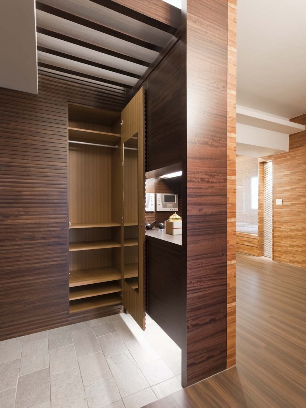 自成一格的玄關區機能相當齊全,別緻的格柵天花板撒下柔和光線,並備有衣帽間、鞋櫃、燈光展示區等附加機能。