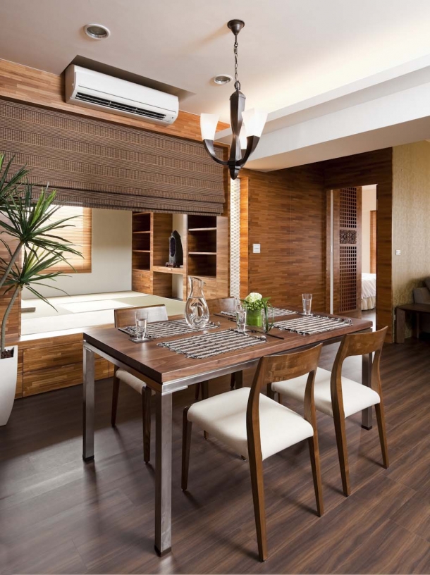 餐桌旁另有高雅的和室機能,搭配深褐色麻質羅馬簾輔助界定,架高的地板上滿鋪榻榻米,寧靜悠閒的氣氛特別有吸引力。