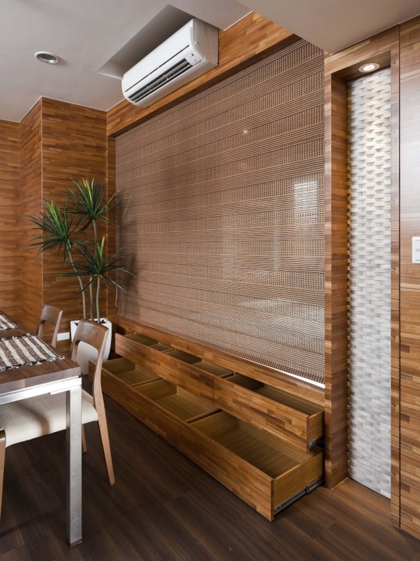 和室架高的地板下方特地規劃兩層拉抽,同時也能當作踏階來使用,連帶周邊立面全數以集成材施作,展現無可挑剔的完成度與精緻質感。