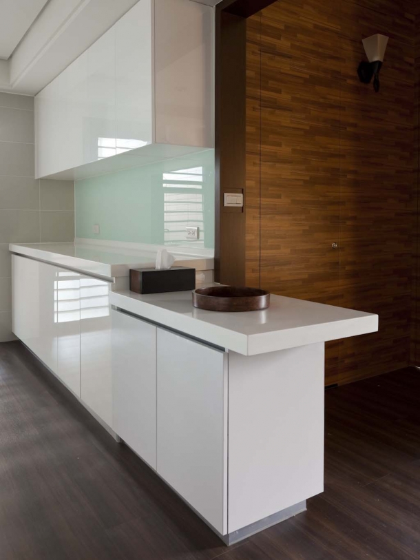 廚房開口刻意放大,並搭配木作邊框強調空間切割的立體感,除了兩行並列的料理工作區,並加作向外延伸的備餐檯,帶動餐廳與廚房間的互動串連。