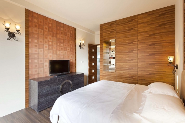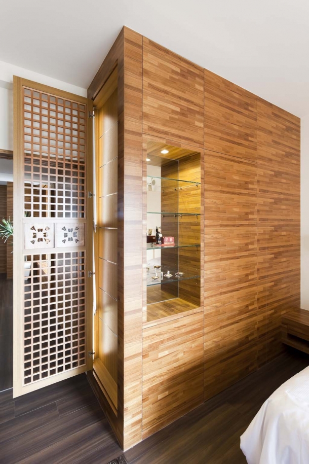 主臥室床側安排專屬更衣間,並附設內嵌的玻璃精品櫃,正面以梔子花雕刻飾板搭配格柵的立面造型,巧妙融合峇里島與禪風兩者鮮明的風格語彙。