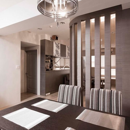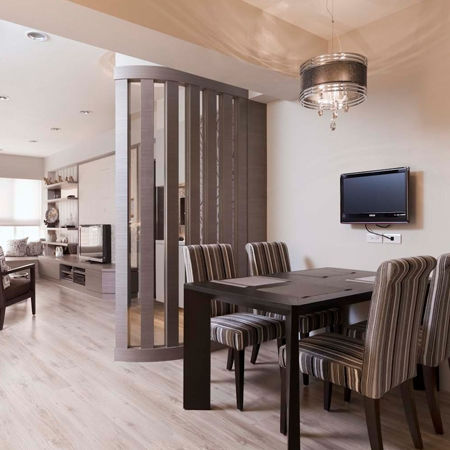 適當留白可以帶來更多的生活想像,填上專屬的記憶、個性與品味,打造一室清朗明美。客廳沙發背牆規劃完整收納櫃機能,壁紙、茶鏡、木皮異材質的混搭風格,打造獨一無二的牆面美學。進門處一道弧形格柵造型牆巧妙解決風水忌諱,既保留與餐廳的視覺互動也形成玄關角色。走道淨空,以地坪延縱深感,放大空間氣勢,也保留前後採光不被阻礙。