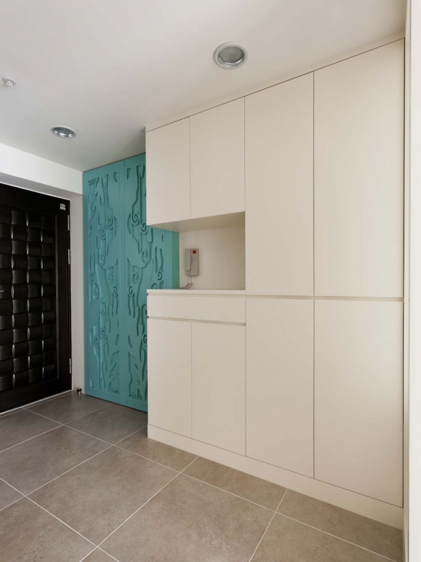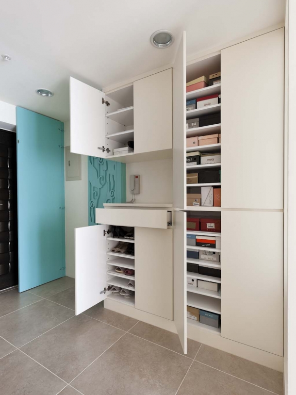 大門旁對稱的藍色雕花造型,實際上是修飾家中電表、弱電箱的細膩巧思,而右側相鄰的白色收納高櫃設計,滿足主人大容量的鞋類儲放需求。