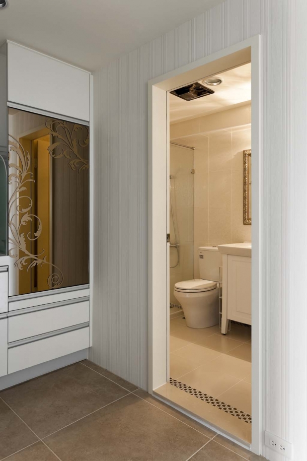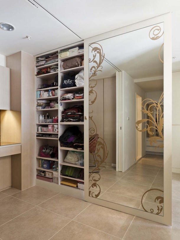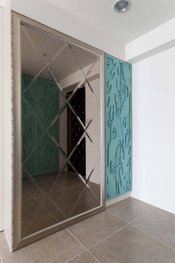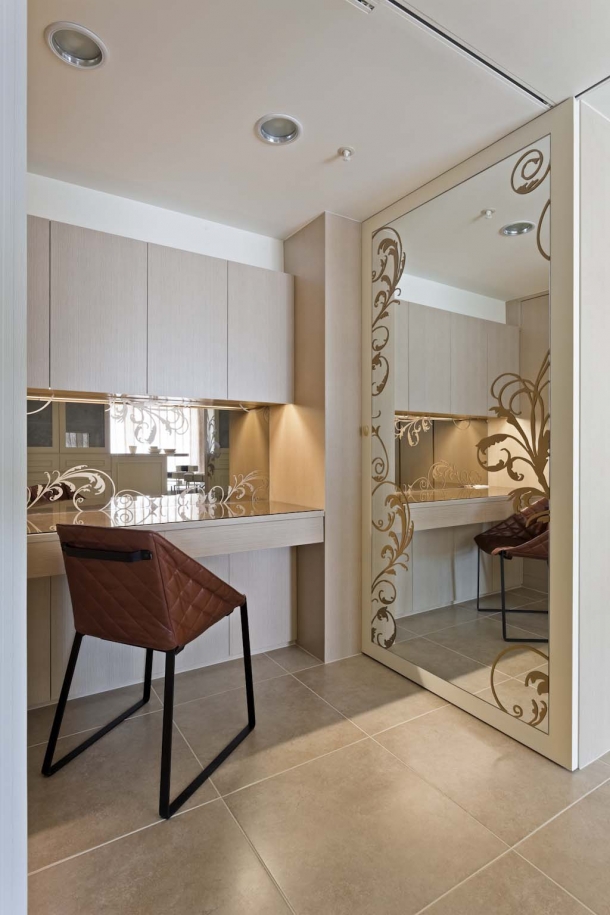 玄關鏡牆後方就是畫面右側的美麗鏡櫃,我們利用鏡面圖騰噴砂的技巧,為單純的門片注入更多的藝術美感,不僅具備夢幻穿衣鏡的實用性,當拉門右移時還能作為界定公、私領域的彈性介質。.jpg)