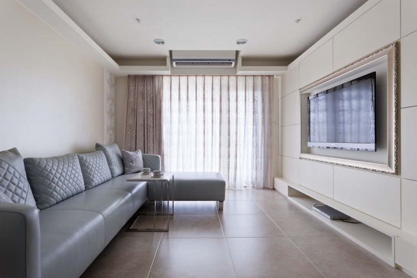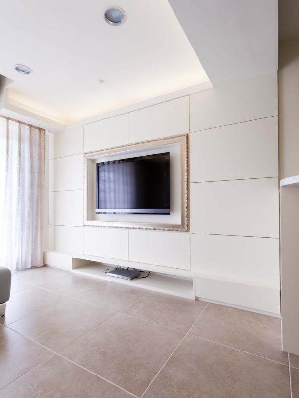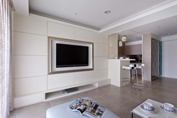 客廳主牆以簡約的水平、垂直線條分割,中央壁掛電視處點綴淺金色藝術邊框來加強立體感。