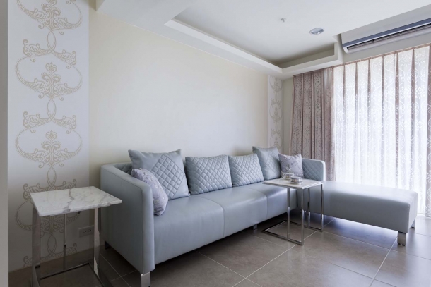 沙發背牆以米色刷漆為主題,兩邊搭配對稱的壁紙圖案掌握視覺平衡,透過微量的古典元素,提升空間的細緻美感。