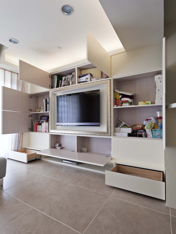 客廳電視牆看似極簡的分割線條,每一格打開來都是實用的收納空間,驚人的大容量可以儲放所有日常用品,這是利用完整的連續面造型取代大量櫃子的積極巧思。