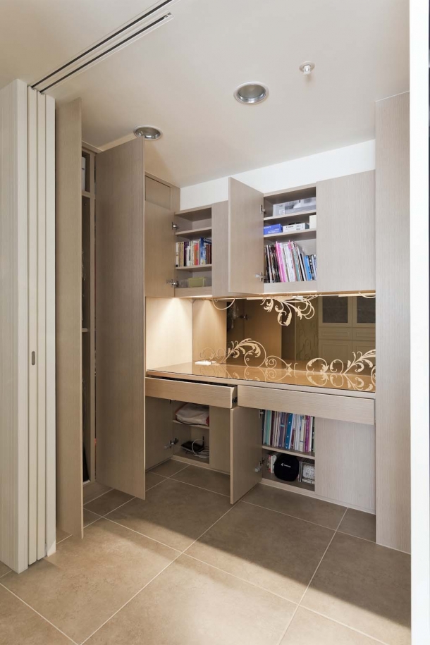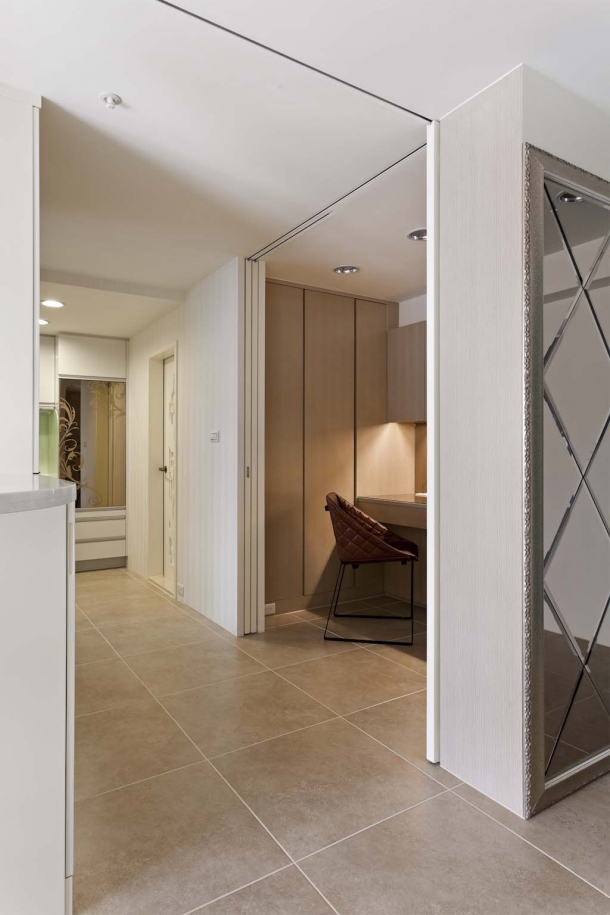 玄關鏡牆後方規劃為多功能空間,入口處以精美絕倫的白色雕花拉門界定,平時可以折疊收攏;輕巧又不佔空間,而此區除了梳妝、也能當作工作書房和更衣間來使用,機能十分齊全。