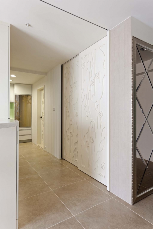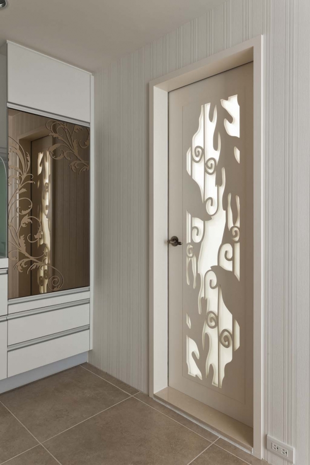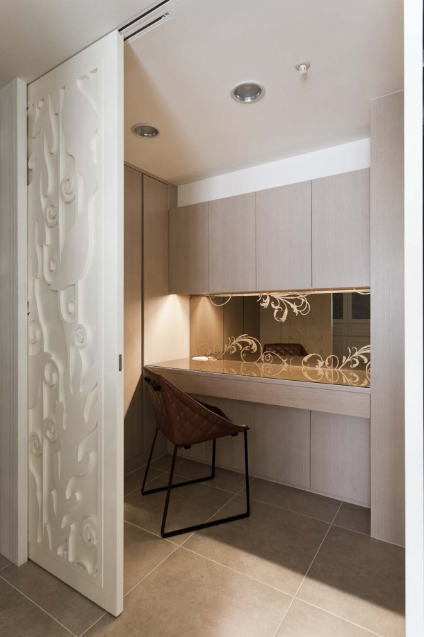 空間設計是非常講究個人化的創意產業,我們針對不同屋主的職業背景、生活需求、喜好、作息方式作為規劃方向,透過詳細而深入的溝通,一步步建立未來家居的完美輪廓。在這處散發著時尚輕古典風情的精緻住宅裡,除了主臥室以外;兼具書房、更衣間與梳妝室機能的多功能區設計是一大重點,並搭配美侖美奐的白色浮雕拉門界定,而這拉門上的雷射雕刻圖案,同時應用在屋子裡的多處空間立面,微妙串連前後呼應的風格美學。