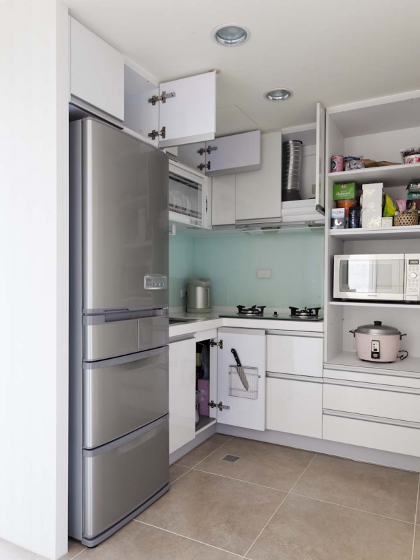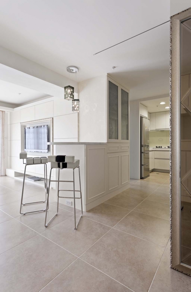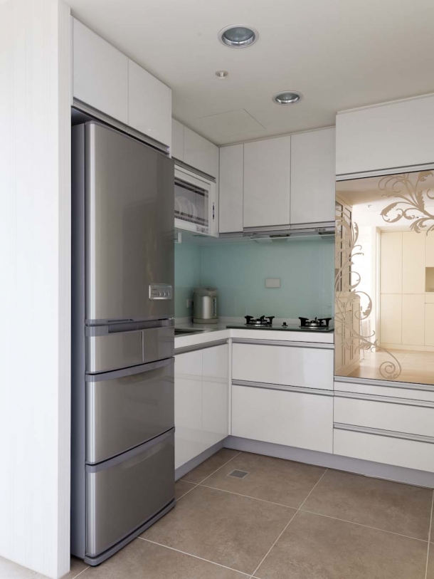 小巧的廚房搭配一系列白色廚具,右側家電櫃特製的茶鏡噴砂門片格外賞心悅目,而類似的鏡面噴砂效果,也成為全案前後呼應的風格元素之一。.jpg)