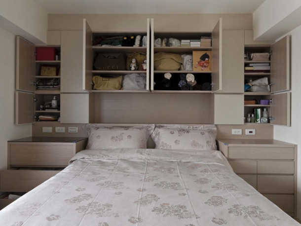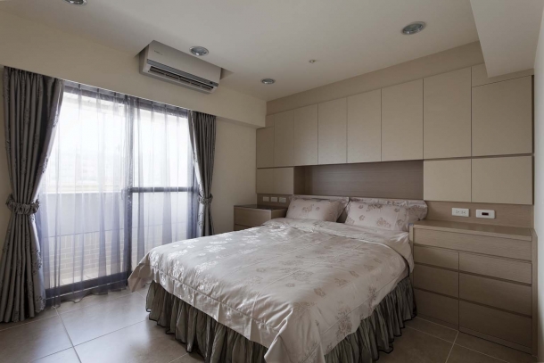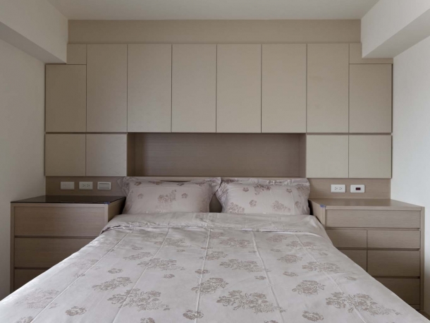 主臥室利用床頭樑下空間規劃大容量收納機能,簡潔的線條分割並強調對稱性,掌握沈穩安定的空間中軸,同時也自然而然消除量體的壓迫感。