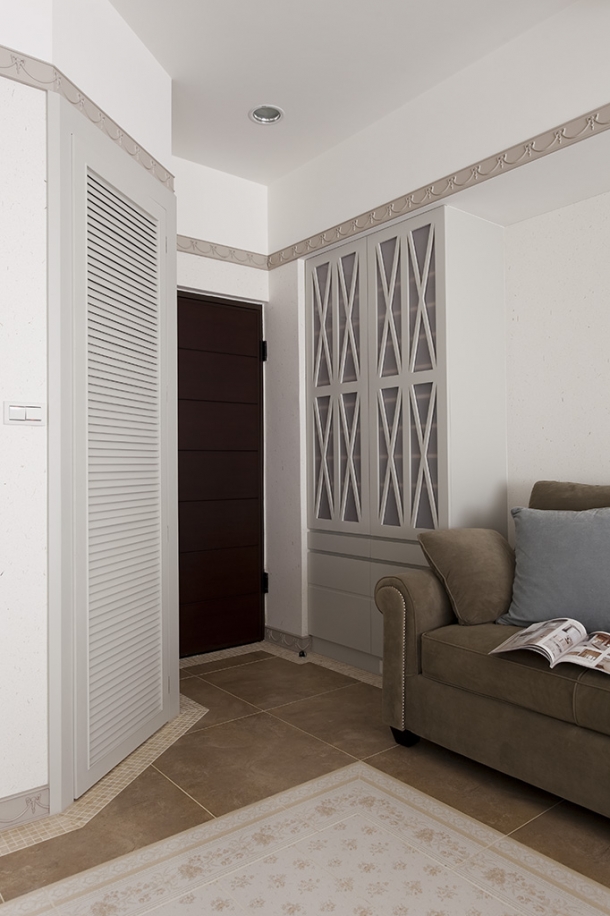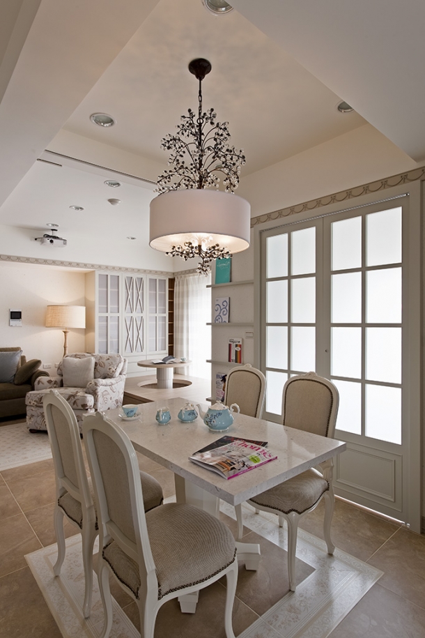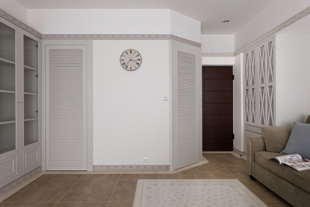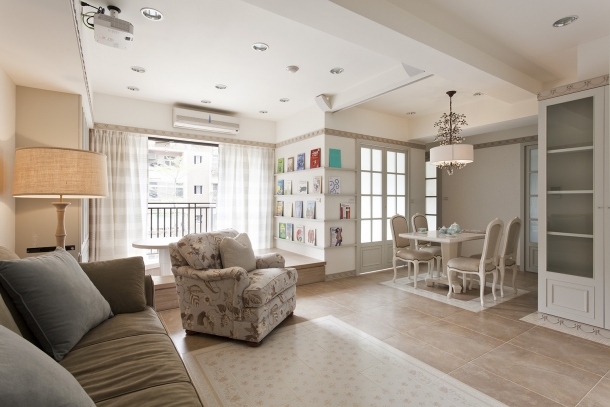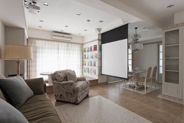 為了放大既有空間感,從立面、櫃體到家具的色調,都使用同一張色票進行配對,希望透過單一明亮色系的烘托,延展整體空間感。另外,環伺立面上方均有一條藝術線板貫穿,讓空間藉由比例劃分,拉長空間高度,產生空間擴張感,同時客廳以投影螢幕取代電視,讓居家大部分時間維持開敞格局。.jpg)