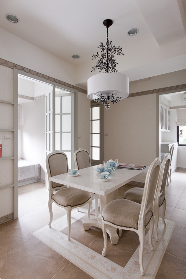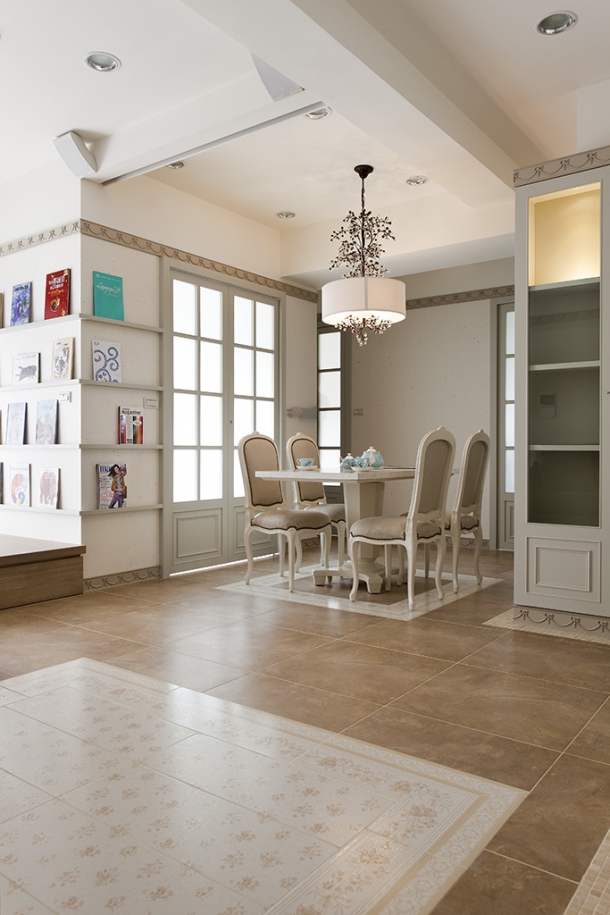 開放連貫的客廳與餐廳,地板還舖設圖騰地磚加上滾邊裝飾,猶如地毯般,豐富公領域視野與趣味性,就算坪數不大,也能展現豐富設計巧思。