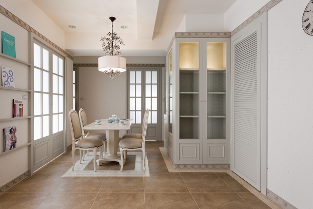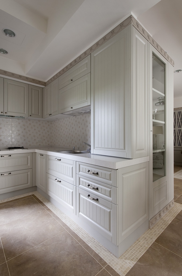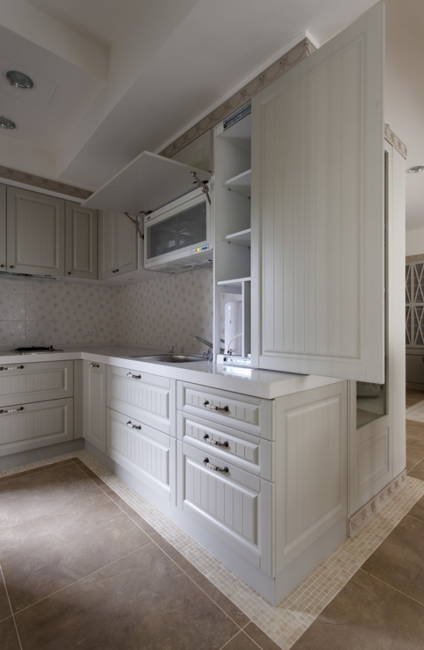 廚房櫥櫃以簡化的古典門板作為美型修飾,讓碗盤鍋具、抽油煙管以及淨水器都可隱藏在內,維持視野的乾淨優雅,讓居家不會因為紊亂而更顯得狹小。