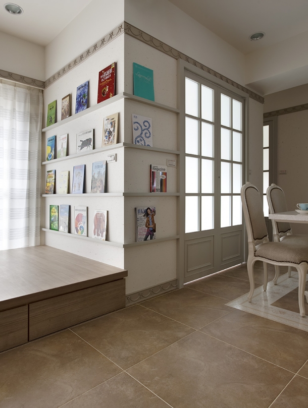坪數只有18坪,在不減少使用面積前提下,空間設計首先著重在機能需求與空間美感的結合。像藉由櫥櫃包裹牆面與柱體,強化收納機能,然後在客廳靠窗處規劃的和室,除了可以看到架高平台有升降式桌子,下方還是收納櫥櫃,而一旁牆面更規劃一條條3cm厚的置物層板,可以同時兼顧收納與陳設展示。