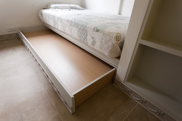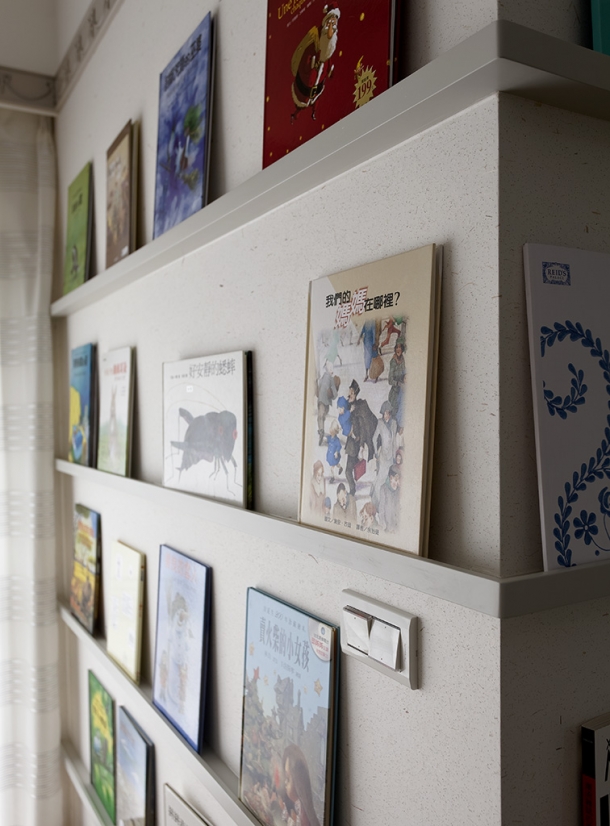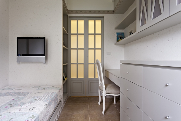 小孩房沿著兩側分別配置臥床與書桌、書櫃,其中臥床設計成子母床,未來家中如有新成員,再擺放床墊即可。