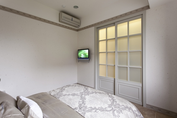 面向餐廳的臥室門板設計成雙開門,希望藉由比例尺度的調整,擴張視野感受,而且門板鑲嵌霧面玻璃,讓自然天光得以灑落至餐廳,改善中段採光略顯不足的困擾。