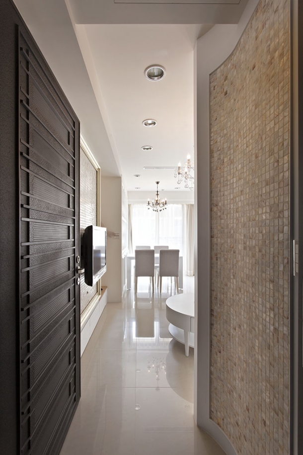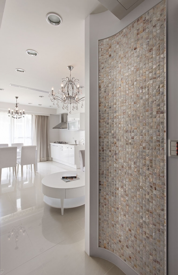 進門的玄關右側,特地以一座弧線收邊的精緻造型隔屏,屏障直通客廳沙發區的視線,隔屏立面以瑰麗的珠貝馬賽克施作,營造精美絕倫的第一印象,同時也和電視主牆進行視覺上的呼應。