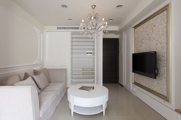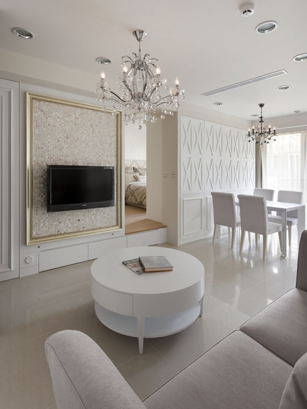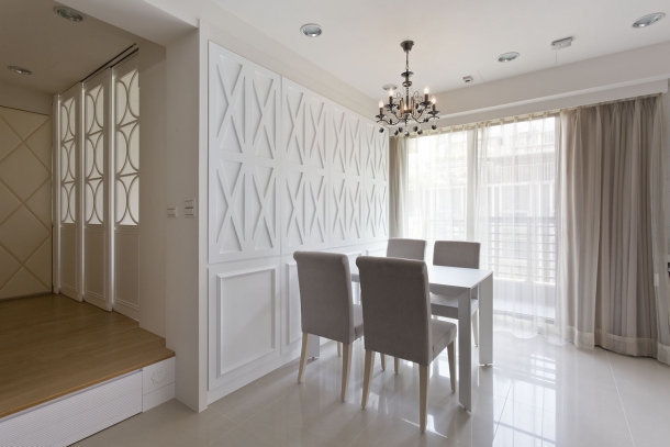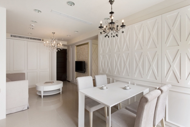 客廳與餐廚區採開放式規劃,平整簡潔的天花造型讓空間感格外寬敞,並搭配兩盞不同的水晶燈飾界定空間屬性,室內配色以明亮的柔白搭配淺膚色系,穿插其間的古典雕花線條大大提升空間的藝術性。