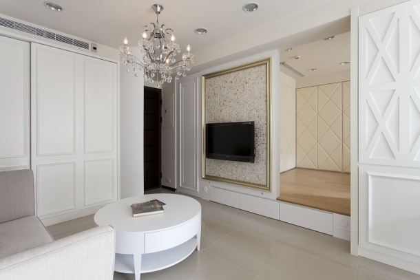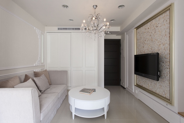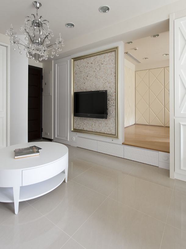 客廳精緻的電視牆,以珠貝馬賽克為主題,周邊鑲上高貴的玫瑰金畫框,平添視覺的細膩奢華,而主牆右側是進入臥室、更衣室兼起居和室的動線開口,巧妙而清楚的劃分公、私領域。