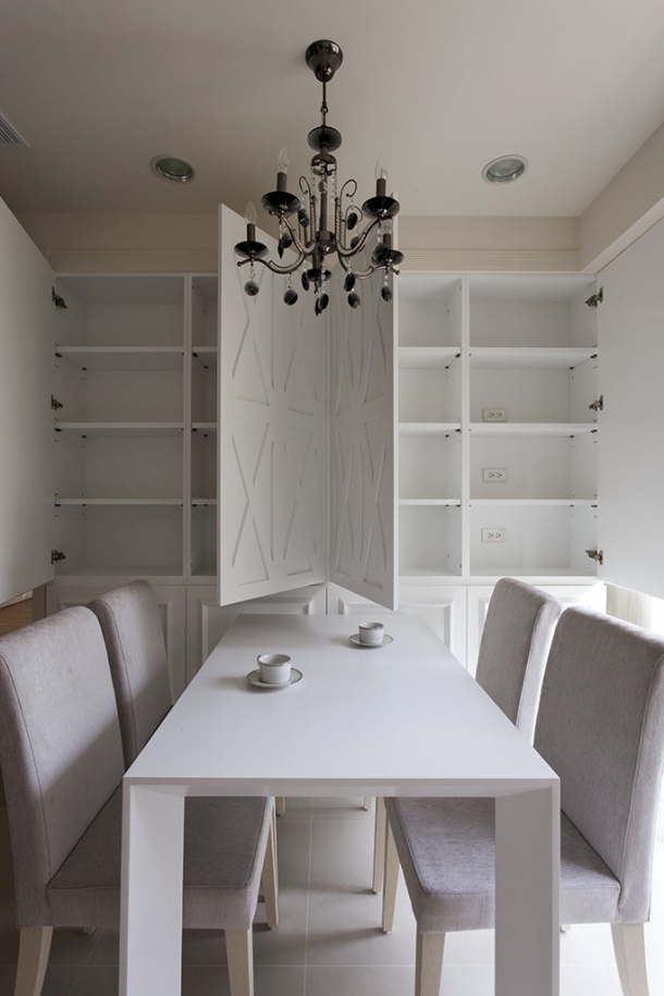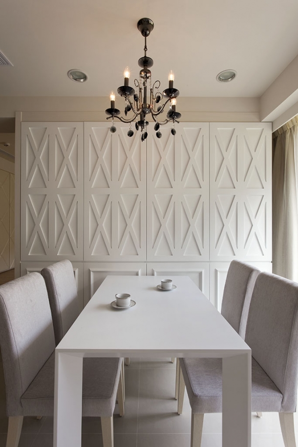 X型交會的線條語彙是串連全宅的重點設計元素,包括餐廚區一整面的白色餐櫃外觀,更衣間內的衣物櫃門片,儘管使用材質不同,卻精彩整合了一致的獨到品味。