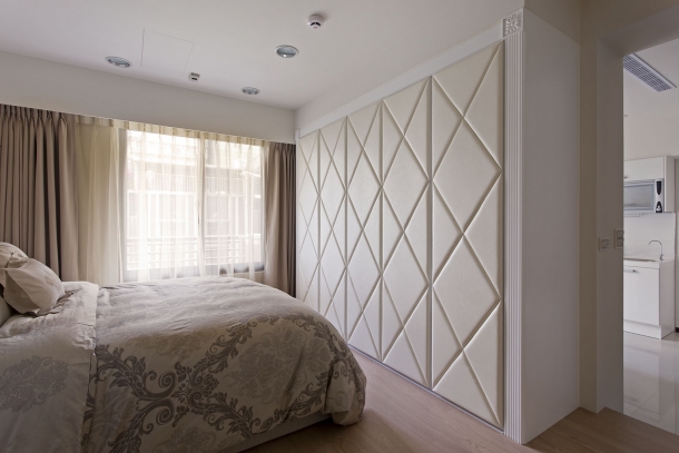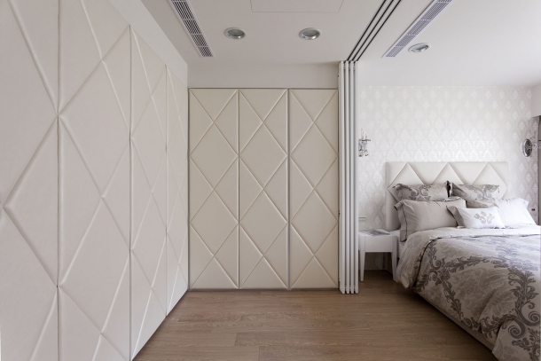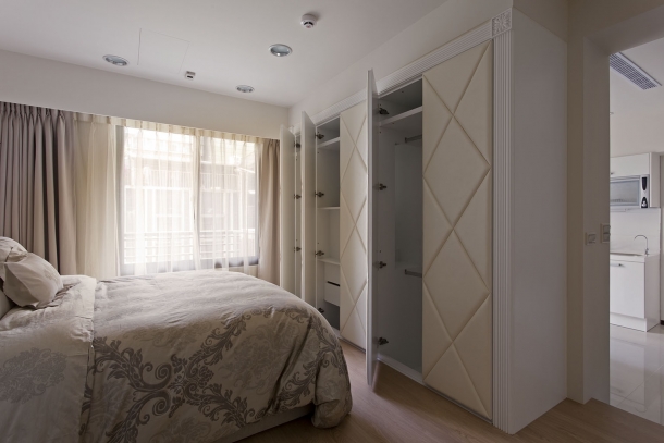 主臥室床尾處同樣規劃成與更衣間相同造型的衣物高櫃,同時也是以櫥櫃取代隔間的精彩示範。