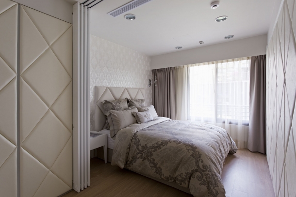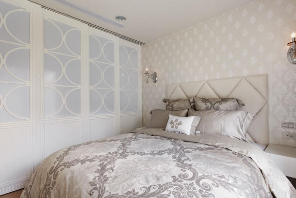 優雅的主臥室內,挑選美麗的古典壁紙搭配對稱燭台壁燈美化床頭牆面,連軌的造型拉門也是兼具實用性的裝置重點。.jpg)