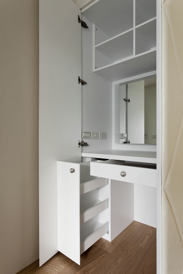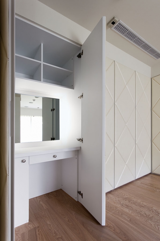 利用更衣間整排衣櫃的右側,巧妙規劃隱藏式梳妝區,檯面下還內藏拉抽與側櫃,細節處充滿貼心巧思。