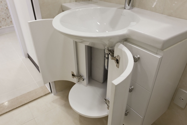 浴室雖然空間不大,但是圓形面盆下方也搭配圓筒型的浴櫃設計。